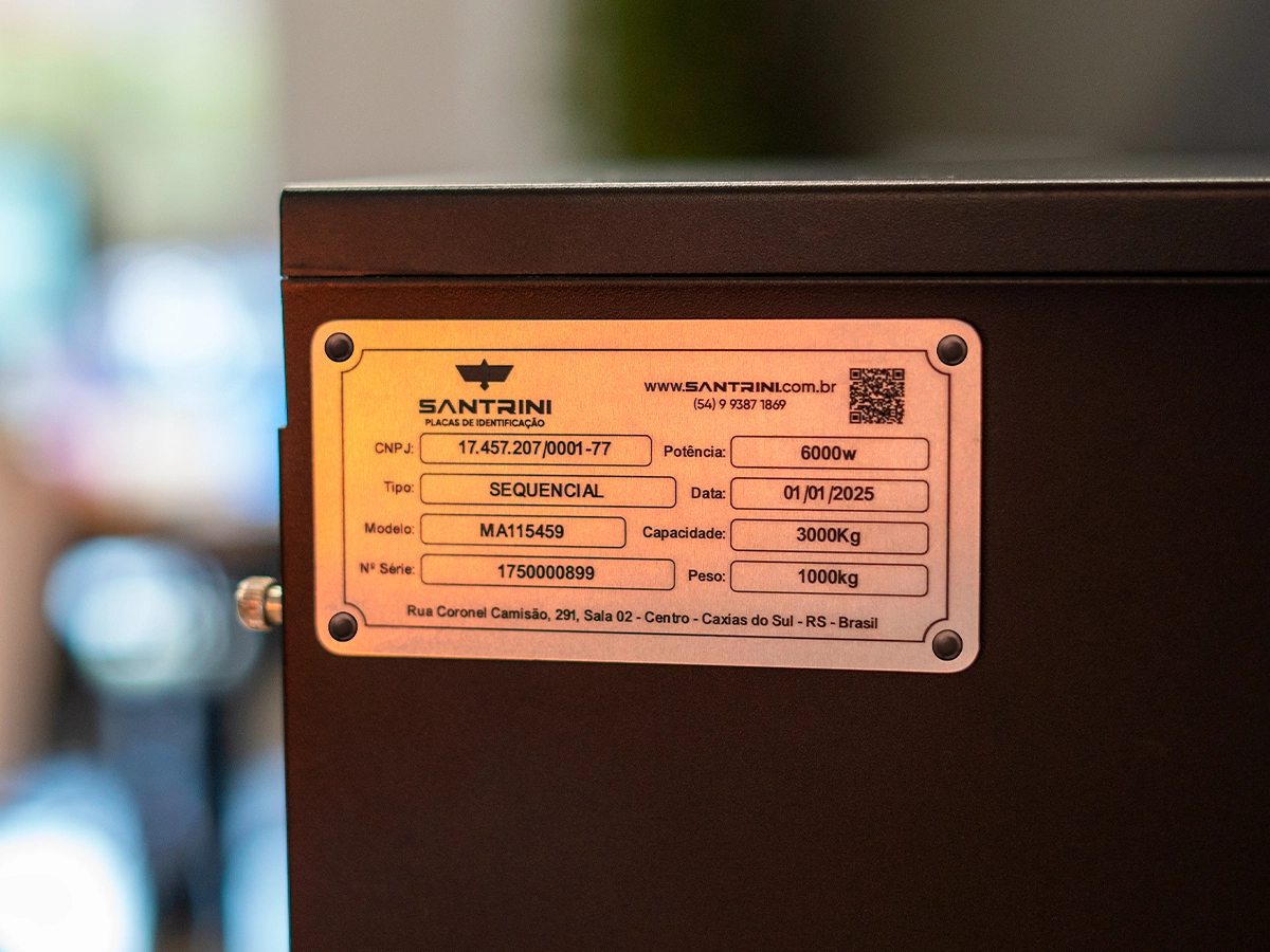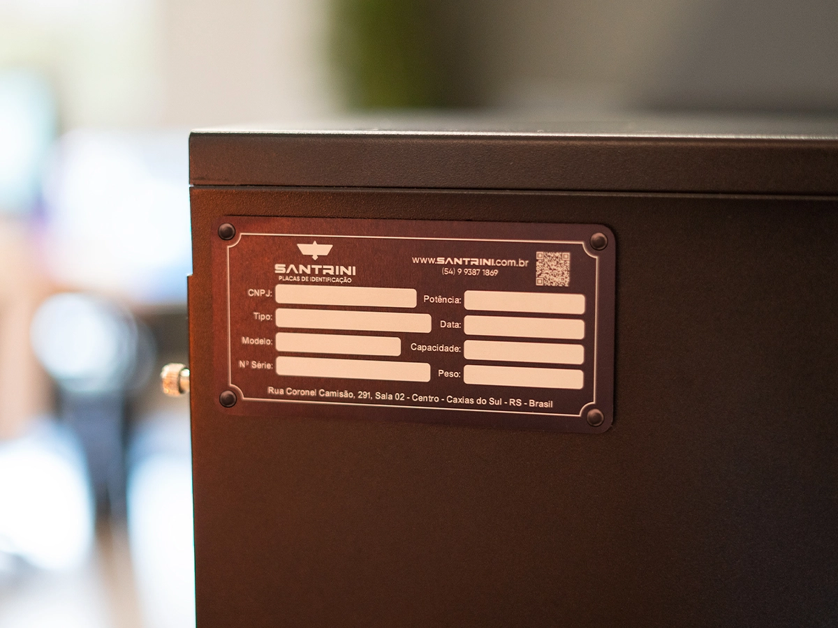 A Santrini oferece a fabricação e gravação a laser para chapas metálicas em inox 304 de 1 mm de espessura e em alumínio anodizado de 0,2 mm para sinalização, identificação patrimonial, etiquetas técnicas e placas de homenagem. A tecnologia utilizada permite a reprodução exata de logotipos, textos, códigos e outras informações com altíssima definição, permitindo marcações detalhadas em grandes superfícies sem comprometer a integridade do material.